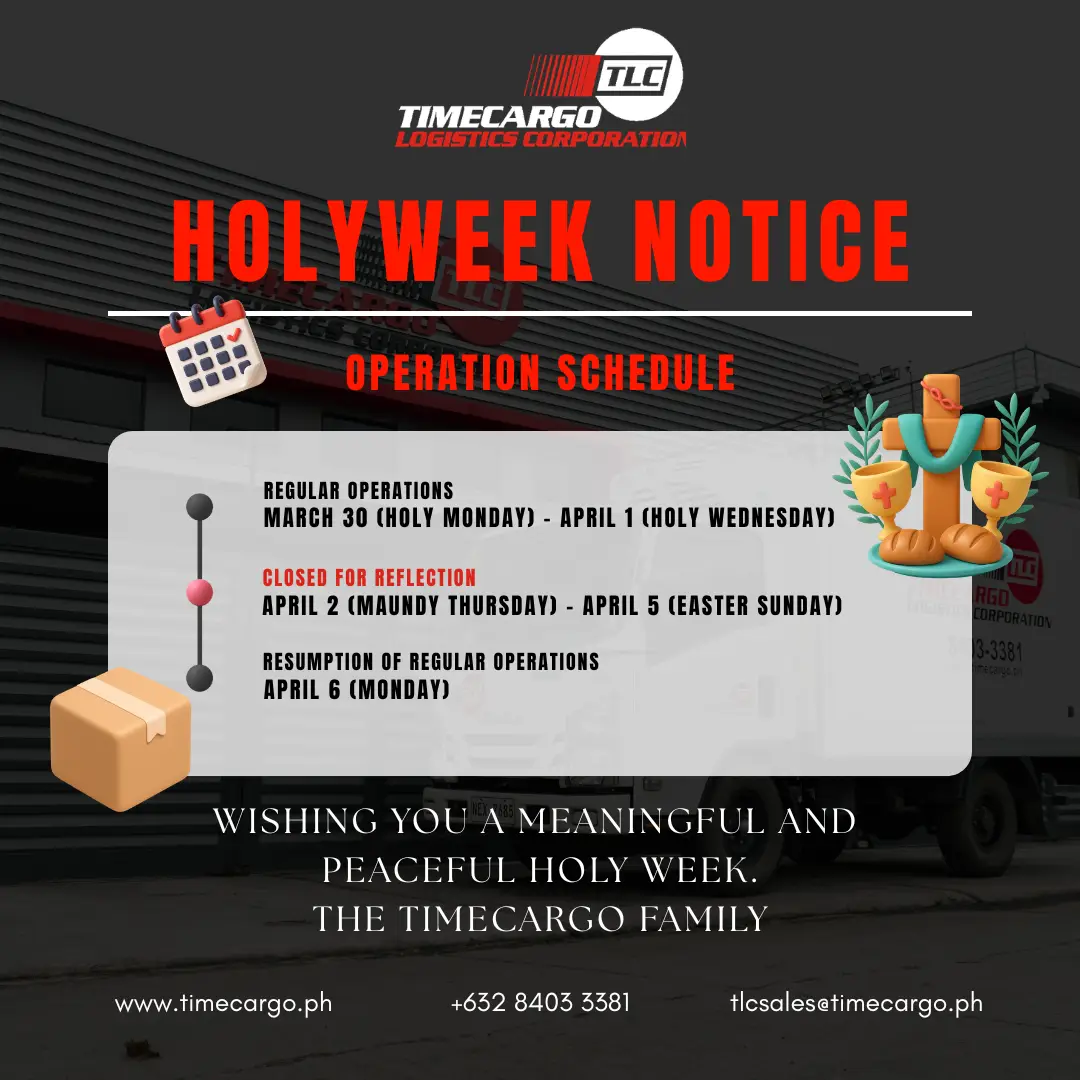 Hi everyone! To give our hardworking team a well-deserved rest this Holy Week, Timecargo Logistics Corporation will be observing the following schedule. Your deadlines matter to us! Let’s plan your shipments early this week to keep your business moving...
