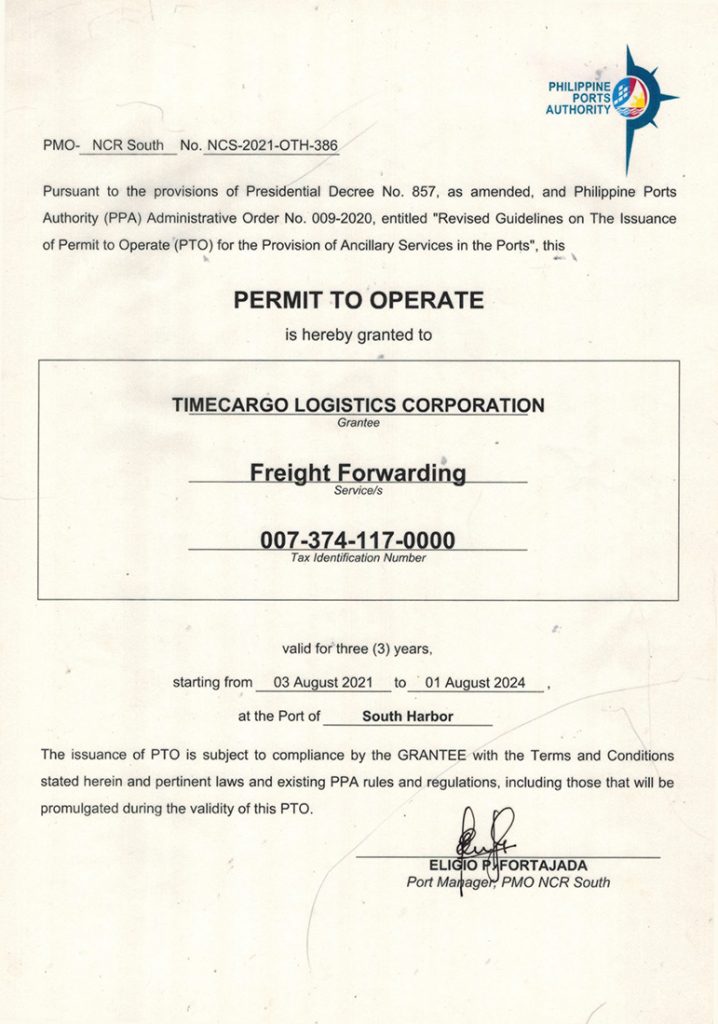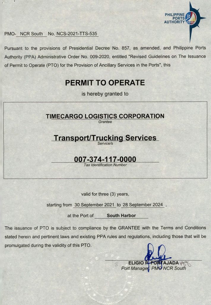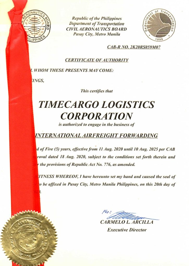 Timecargo Logistics Corporation has been granted accreditation by the Civil Aeronautics Board as well as Permit to Operate for Freight Forwarding and Transportation/Trucking Services.