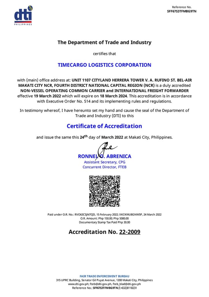 Timecargo Logistics Corporation aims to be the most reliable and preferred service provider for the logistics industry. The accreditation is a reflection of the company’s commitment to quality service delivery, adherence to regulatory requirements, and excellence in business practices for the benefit of its customers.