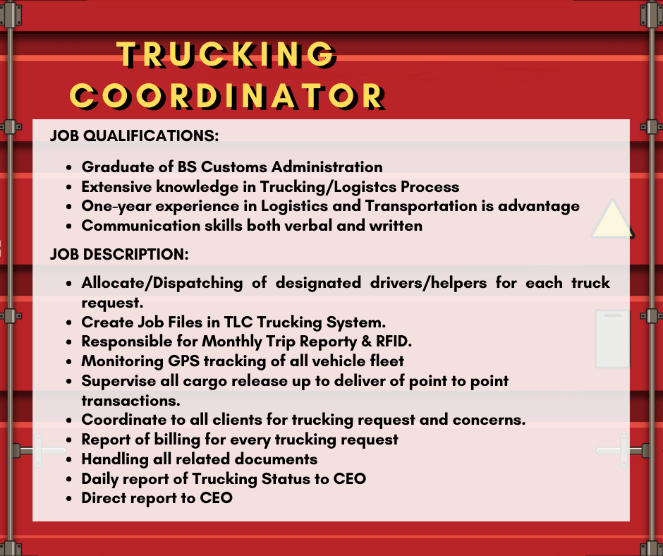 We are hiring! TRUCKING COORDINATOR Job Qualifications: • Graduate of BS Customs Administration • Extensive knowledge in Trucking/Logistcs Process • One-year experience in Logistics and Transportation is advantage • Communication skills both verbal and written Job Description: • Allocate/Dispatching of designated drivers/helpers for each truckrequest. • Create Job Files in TLC Trucking System • Responsible … Read more
