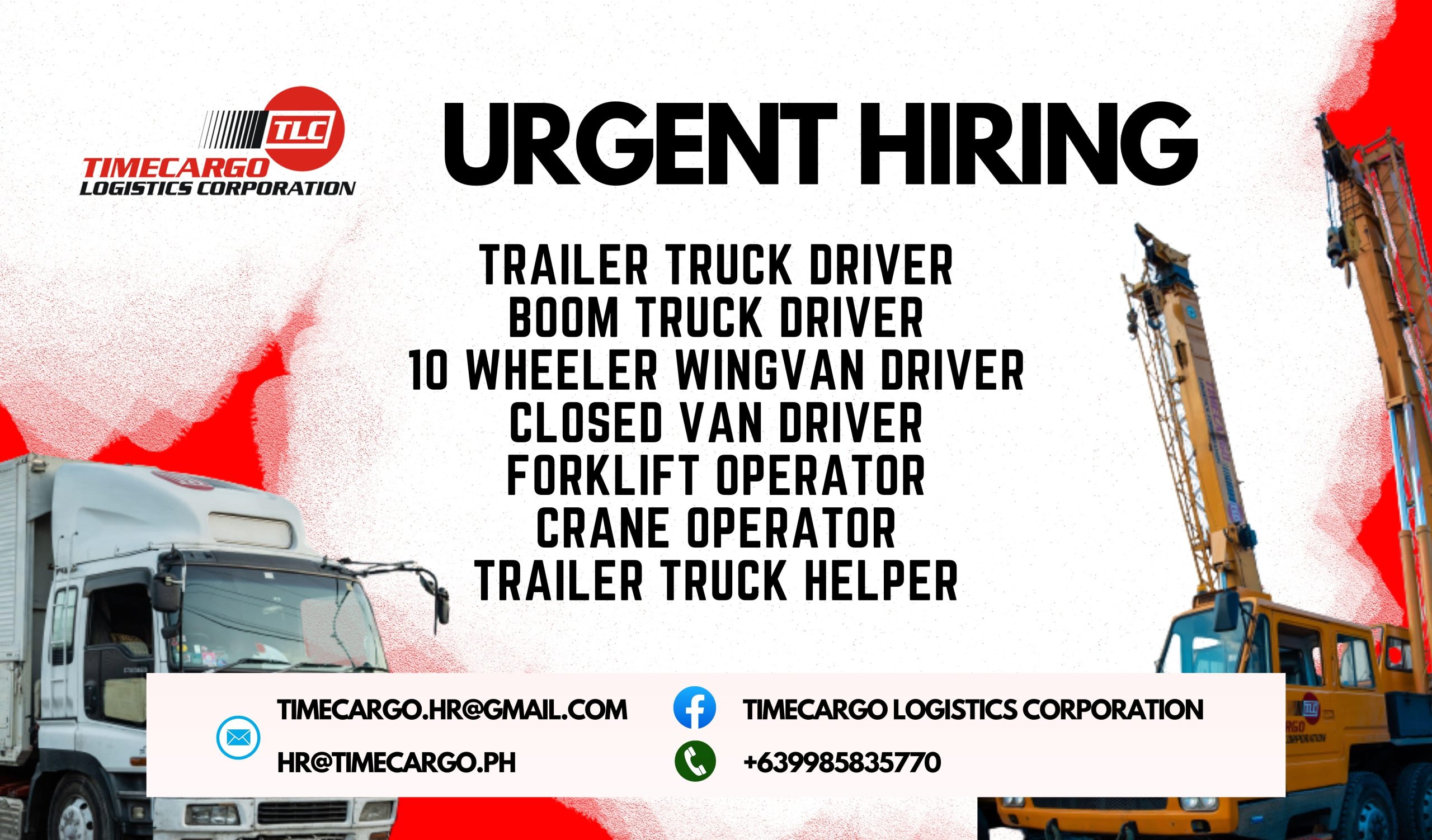 • TRAILER TRUCK DRIVER • BOOM TRUCK DRIVER • 10 WHEELER WINGVAN DRIVER • CLOSED VAN DRIVER • FORKLIFT OPERATOR • CRANE OPERATOR TRAILER • TRUCK HELPER Contact Information: Email: timecargo.hr@gmail.com or hr@timecargo.ph Phone: +639985835770