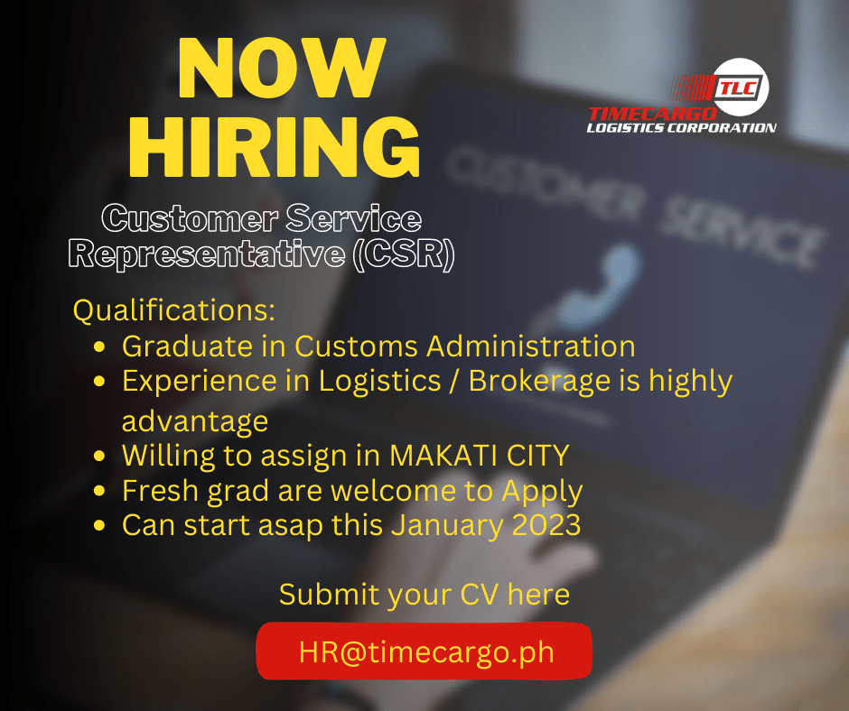 Now hiring! CUSTOMER SERVICE REPRESENTATIVE (CSR) Qualifications: • Graduate in Customs Administration • Experience in Logistics / Brokerage is highly advantage • Willing to assign in MAKATI CITY • Fresh grad are welcome to Apply • Can start asap this January 2023 Contact Information: Email: timecargo.hr@gmail.com or hr@timecargo.ph Phone: +639985835770