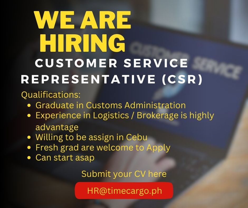 We are hiring! CUSTOMER SERVICE REPRESENTATIVE (CSR) Qualifications: • Graduate in Customs Administration • Experience in Logistics / Brokerage is highly advantage • Willing to be assign in Cebu • Fresh grad are welcome to Apply • Can start asap Contact Information: Email: timecargo.hr@gmail.com or hr@timecargo.ph Phone: +639985835770