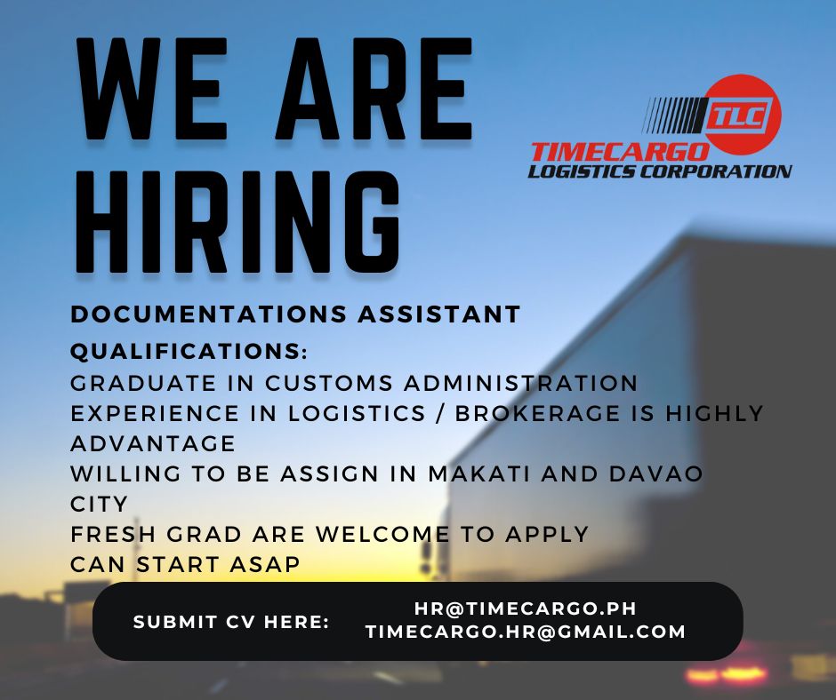 We are hiring! DOCUMENTATIONS ASSISTANT Qualifications: • Graduate in customs administration • Experience in logistics / brokerage is highly advantage • Willing to be assign in Makati and Davao City • Fresh grad are welcome to apply • Can start ASAP Contact Information: Email: timecargo.hr@gmail.com or hr@timecargo.ph Phone: +639985835770